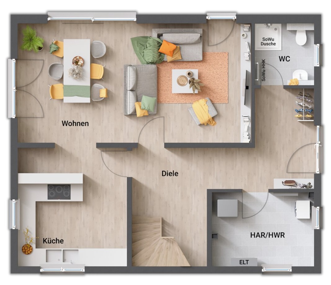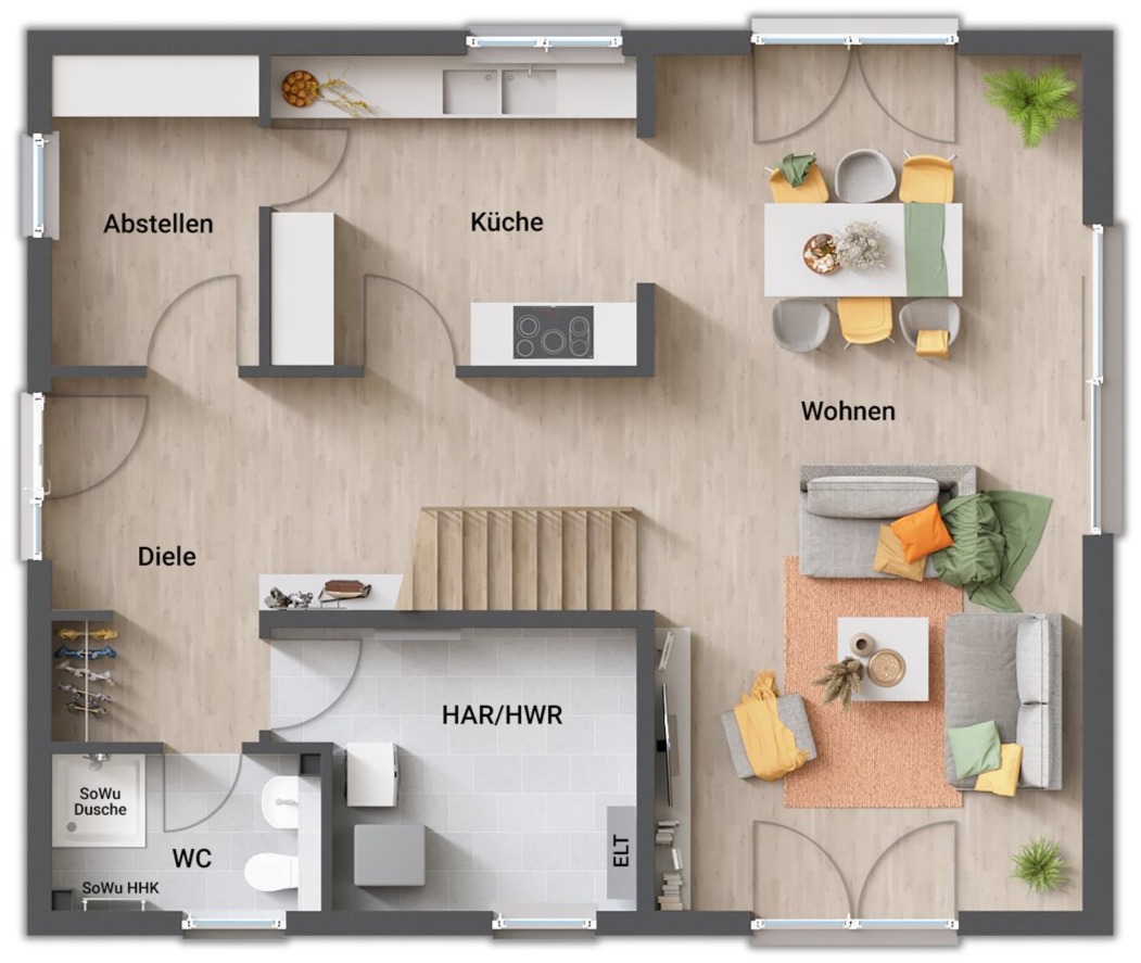- gerade Treppe (zentral im Erdgeschoss, „teilt“ Koch- und Wohnbereich)