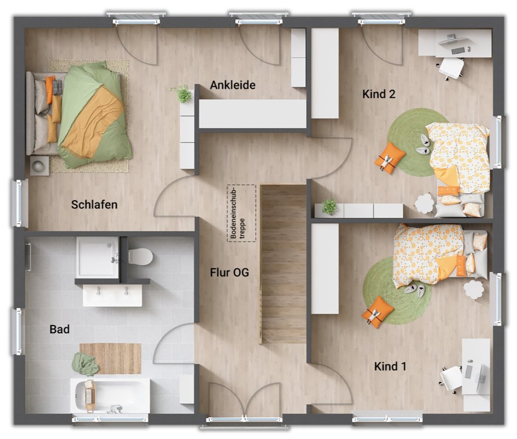 Auch das Obergeschoss zeigt sich im gradlinigen Baustil des Hauses. Hier finden Sie drei Zimmer, die Sie nach Ihren Vorstellungen als Schlaf-, Kinder- oder Gästezimmer nutzen können. Große Fenster lassen auch hier viel Tageslicht hineinströmen. Die Ankleide im Schlafzimmer bietet viel Stauraum.